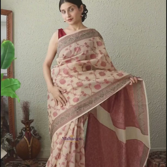 The saree features delicate resham weaving woven seamlessly into the fabric, creating a classic and timeless appeal. The contrast border and soft colour palette enhance its traditional character without overpowering the look.